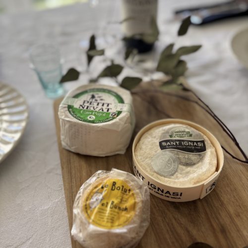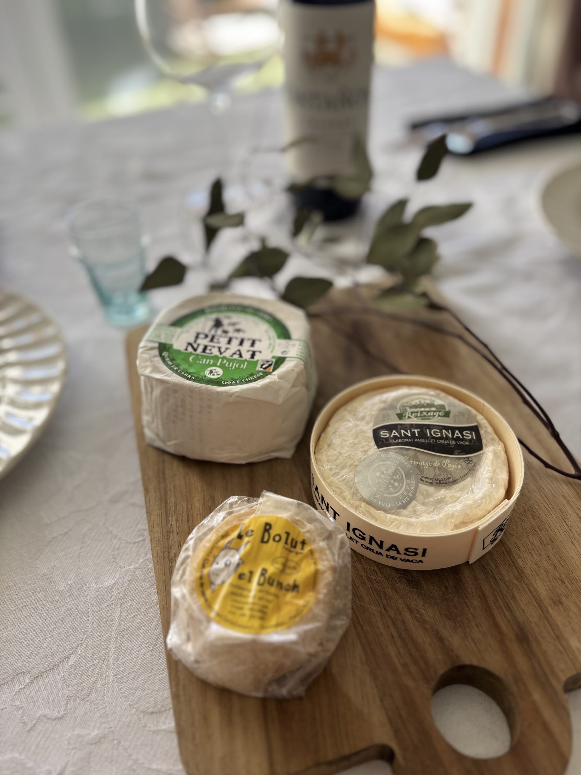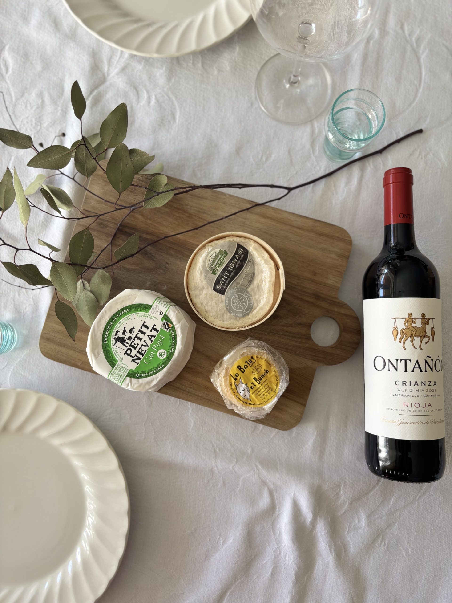 Tabla de quesos de pequeño productor maridados con vino tinto de la Rioja. Podéis escoger vino blanco si os gusta más.