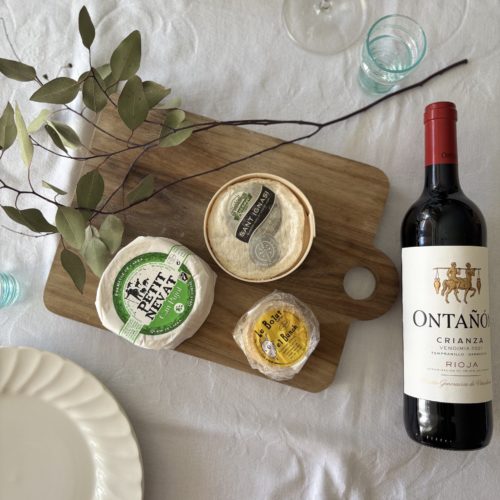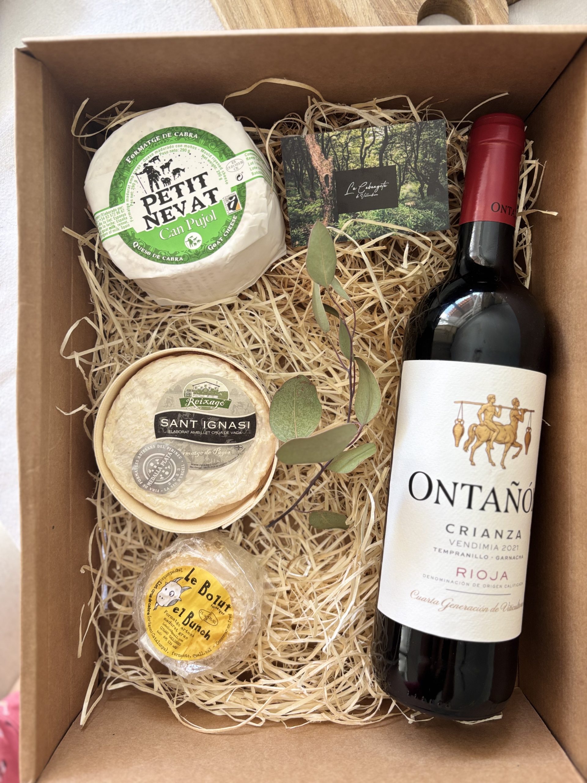 La tabla contiene: vino tinto Ontañon crianza, queso de cabra Petit nevat 100g. queso de vaca Sant Ignasi 100g queso de cabra Le bolut.