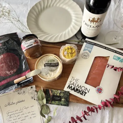La cesta contiene Jamón iberico 100g, queso Sant Ignasi 100g, queso Bunch, melmelada de higos 2100g salmón ahumado 100g, escoger entre vino blanco o tinto..