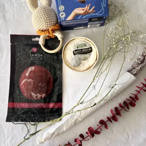 La cesta contiene Jamón ibérico de bellota 100g, fuet de Vic, queso Sant Ignasi 100g Trufas de chocolate y juguete infantil sonajero.