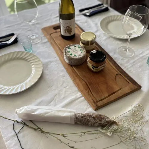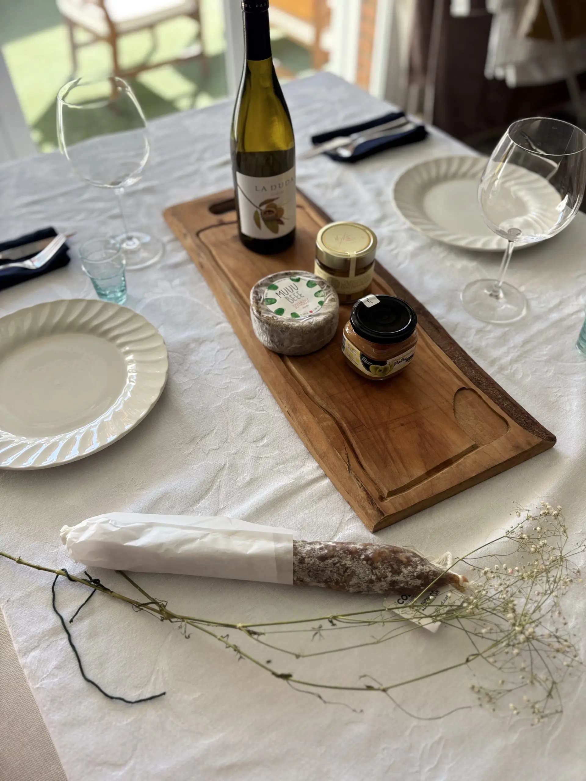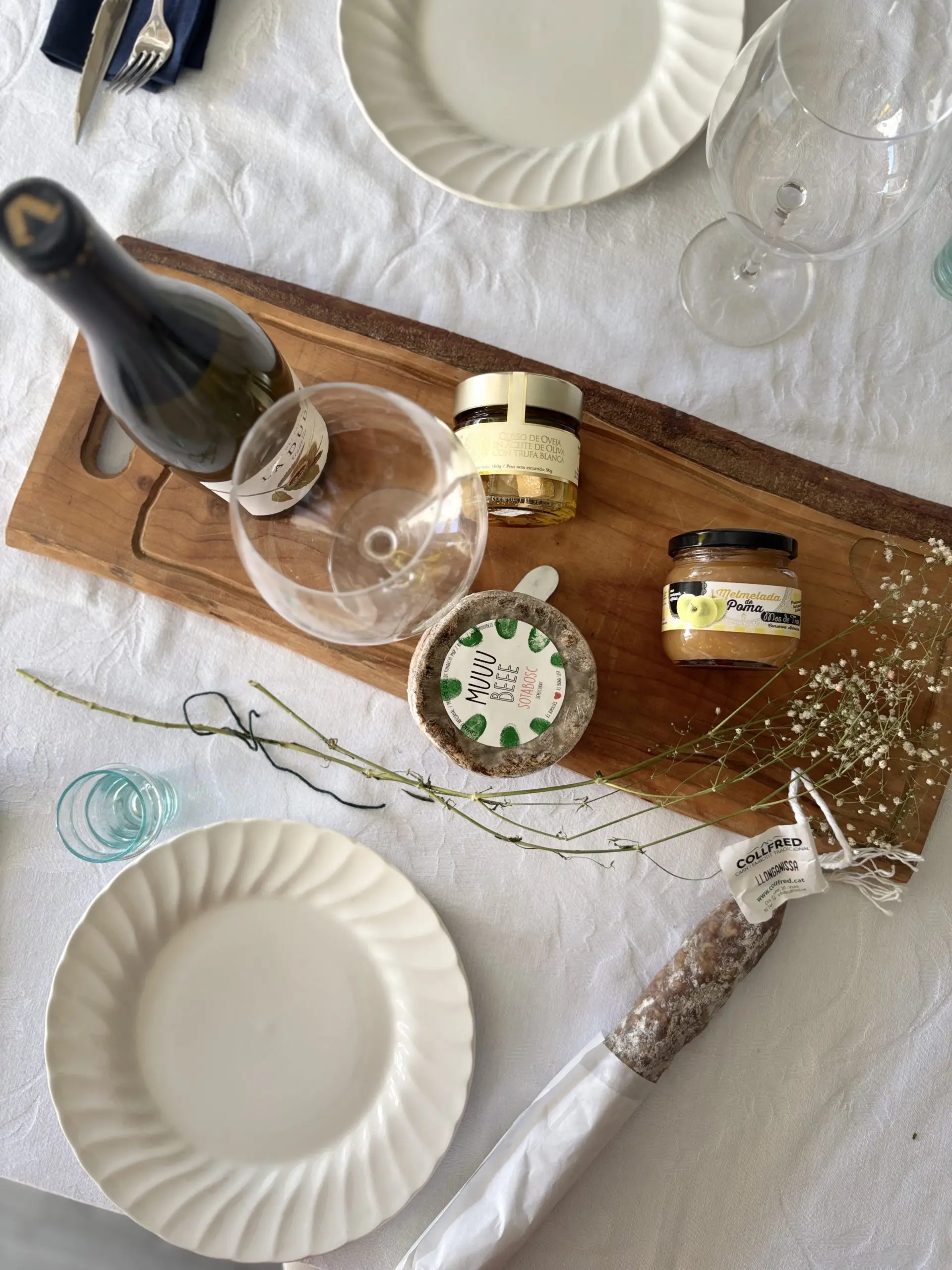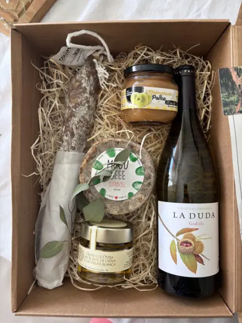 Esta cesta contiene vino blanco La Duda, dados de queso com trufa blanca 90g, queso de oveja sota bosc 400g, longaniza de vic y mermelada de manzana 215g